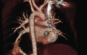 Выявлена секвестрация в нижней доле левого легкого; сегмент кровоснабжается системной артерией от нисходящей части грудной аорты.